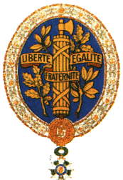 Государственный герб Французской Республики изображен в виде эллипса, в центре которого находятся дикторский пучок-символ власти и республики. На ленте помещены слова: "Свобода, равенство, братство". Все это окружено дубовыми и оливковыми ветвями-символами власти и славы. Цепь, окружающая фигуры на гербе - символ почета и благородства. Внизу овала расположен орден Почетного Легиона.