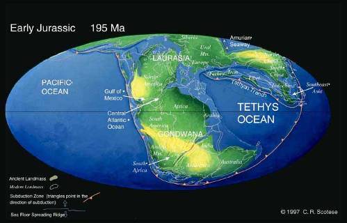 После объединения древних платформ остался по сути лишь один океан – Панталасса. От него внутрь Пангеи гигантским заливом с востока внедрялся океан Палеотетис. [7]