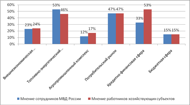 Из приведенных таблицы и диаграммы видно, что мнение опрошенных групп респондентов совпадает по большинству объектов отраслей и сфер хозяйственной деятельности, находящихся под контролем организованной преступности, в первую очередь к ним относятся предприятия топливно-энергетического комплекса, затем следуют предприятия и организации потребительского рынка, а также сфера внешнеэкономической деятельности.