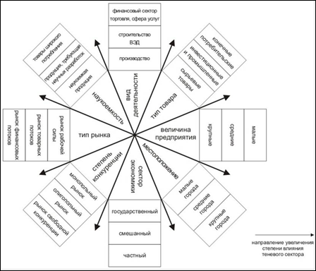 Структурирование рынков по типу конкуренции включает монопольный рынок, олигопольный рынок и рынок свободной конкуренции. Конкурентный рынок с большим количеством независимых участников контролировать гораздо тяжелее, а значит, и возможностей для распространения теневой экономики здесь намного больше.