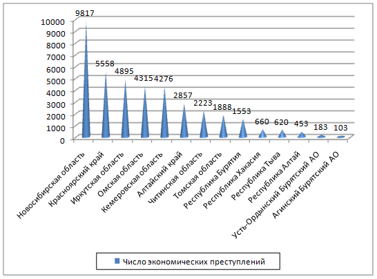 - данные по Сибирскому федеральному округу, показывают, что регионами с наиболее ярко выраженной экономической преступностью являются Новосибирская область и Красноярский край, менее в автономных округах (Усть-Ордынском Бурятском и Агинском Бурятском);