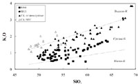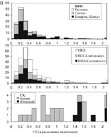 Породы ВВФ, включая вулкан Кизимен, относятся к средне-калиевым сериям (рис.2). Некоторые редкие низко-калиевые толеитовые породы встречаются на вулканах Гамчен и Шмидта. Наиболее высокие щелочи наблюдаются в породах СХ, лавы которого представлены средне-высоко-калиевыми известково-щелочными сериями. Вблизи основания стратовулкана Ичинский были опробованы шлако-лавовые базальтовые конуса, обогащенные HFSE элементами с внутриплитными геохимическими признаками (т.н. базальты внутриплитного типа - ВПТ). При этом сам стратовулкан сложен типично островодужной андезит - дацит - риолитовой серией. Большинство пород ЦКД среднекалиевые известково-щелочные. Некоторые лавы вулканов Плоские Сопки и Толбачик (в т.ч. Южный прорыв 1975-76 гг.) относятся к высоко-калиевым сериям, природа которых требует специального рассмотрения, и в предлагаемой статье излагаться не будет.