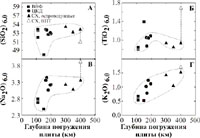 Базальты ВПТ помечены на диаграммах специальными символами. Большинство нормализованых к MgO6.0 редких элементов, в т.ч. HFSE (Zr, Nb, Hf, Ta), LILE (Sr, Ba, Rb, Be, Pb, U, Th), LREE, некоторые макроэлементы (K, Na) и многие отношения элементов (K/Na, La/Yb, Sr/Y, Nb/Yb) обнаруживают положительную корреляцию с глубиной погружающейся плиты. Наилучшие корреляции получены для K2 O, Ba, Sr и Rb, для которых значения возрастают более чем в два раза от фронта к тылу дуги. Na2 O, LREE и HFSE стремительно возрастают от ВВФ к ЦКД, но заметно слабее далее к СХ. При этом Ti даже понижается в лавах СХ в сравнении с породами ЦКД. Для Y и HREE нет значимых корреляций, они остаются постоянными от фронта к тылу дуги. Эти результаты сравнимы с аналогичными исследованиями по Курильской [1] и Японской [26] вулканическим дугам.