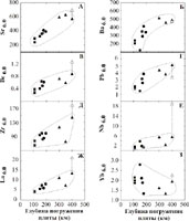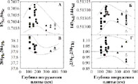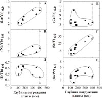 Поскольку отношения несовместимых микроэлементов практически лишены влияния различных степеней плавления и фракционирования, они являются полезным инструментом в изучении процессов обогащения мантии. Миллер и др. [20] показали, что Ce/Pb отношение отражает степень обогащения расплава флюидом, потому что Pb высоко подвижен в нем, но в процессах плавления и кристаллизации ведет себя подобно Ce. В породах Камчатского пересечения нет никакой систематической зависимости Ce/Pb отношения от глубины поверхности субдуцируемой плиты, оно приблизительно постоянно (4-6) во всех трех регионах, только лавы Кизимена из ВВФ и ВПТ Срединного хребта имеют повышенные Ce/Pb значения, предполагая меньшую флюидную добавку в мантийные источники. При детальном рассмотрении поведения La и Pb (рис.5Г,Д), очевидно, что эти отклонения вызваны низкими содержаниями Pb. Это подтверждается также постоянным Ba/Zr отношением (рис.6Е). Эти результаты были так же подтверждены и количественными расчетами [9].