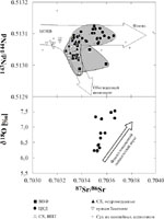 Nd. Флюид, отделяющийся от плиты, имеет такие ожидаемые отношения [11]. Второй тренд, сформированный в основном лавами СХ, идет с понижением неодимовых изотопных отношений при увеличении стронциевых. Такой тренд, вероятно, является результатом смешения с обогащенным мантийным компонентом, что согласуется с нашей интерпретацией о наличии компонента типа OIB в тыловой части дуги.