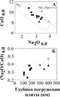 Планк и Лангмюр [24] показали, что степень плавления под активными островными дугами зависит от мощности мантийного клина и выражена в отрицательной корреляции между Ca6,0 и Na6,0 от фронта дуги к тылу. Причина такой корреляции в том, что Ca удерживается клинопироксеном в мантии, а Na - нет. В случае Камчатского пересечения такой тренд должен быть очевиден, поскольку глубина сейсмофокальной зоны увеличивает в 4 раза от ВВФ к СХ. Это мы и наблюдаем на диаграмме CaO6,0 - Na2 O6,0 (рис.11A), где наши данные полностью совпадают с трендом [24]. (Na2 O/CaO)6,0 прогрессивно растет от ВВФ к ЦКД и далее остается постоянным к СХ (рис.11Б). Наивысшие значения Na6,0 найдены в породах ВПТ, что свидетельствует в пользу низких степеней плавления мантии в источнике этих пород. Следуя расчетам [24], породы ВВФ имеют наивысшую степень плавления - 20%. Более низкая степень плавления (9-12%) типична для лав ЦКД и СХ. Сходные оценки были получены и при сравнение разных групп несовместимых микроэлементов [9]. Отсутствие зависимости степени плавления от глубины погружения океанической плиты между ЦКД и СХ можно объяснить в рамках двухстадийной модели Пирса и Паркинсона [23]. На первой стадии плавление инициируется поступлением флюида в мантию, что может быть особенно важно для нашего З-В пересечения в связи с высвобождением больших объемов флюида при субдукции подводного Императорского хребта под Камчатку. Вторая стадия является результатом декомпрессионного плавления при уменьшении плотности обводненной мантии и процесса внутридугового спрединга, проявленного в настоящее время в ЦКД.