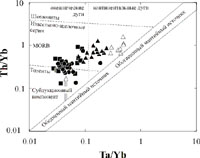 Диаграмма Th/Yb - Ta/Yb использовалась Пирсом [22] для выявления между обогащенным и обедненным источниками в примитивных островных базальтах (рис.12). Вариации состава мантийного источника должны выражаться в изменении обоих отношений. Образцы ВВФ и ЦКД попадают в область океанических островных дуг, находясь на границе толеитового и известково-щелочного полей. Лавы СХ формирует узкое поле, простирающееся от океанических дуг к обогащенному мантийному компоненту. Расположение всех фигуративных точек Камчатских лав (включая образцы ВПТ) над полем мантийной "стрелки" вызвано флюидной добавкой Th при постоянном Yb, предполагая добавку флюида к различным (от обедненного до слегка обогащенного) мантийным источникам. Более близкое положение лав ВПТ СХ к полю мантийных значений указывает на меньшее влияние в них флюида.