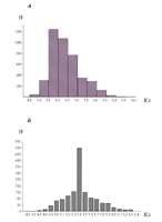 Нами были построены гистограммы распределения числа землетрясений по энергетическим классам для 1-3 слоев (рис.5,А) и в слое 4 (рис.5,Б). При построении использовались данные за 1978-1995гг по 1351 землетрясению в интервале глубин -4-20 км и данные по 2015 землетрясениям с глубиной 20-40 км. Очевидно, что распределение числа землетрясений по Кsдля глубин 20-40 км близко к нормальному закону и отличается от распределения для верхних горизонтов глубин, сходного с распределением для тектонических землетрясений (см., например, [28]).