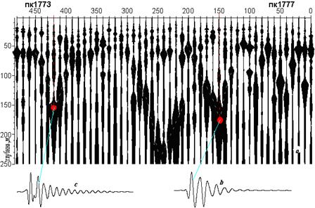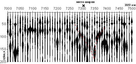 На рис.3 приведен ССП-разрез, пройденный вблизи с пикетом "1853 км", также рядом с местом аварии на трубопроводе. Здесь авария произошла в расположении самого V-образного объекта.