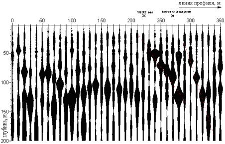 Летом 2000-го года было сделано профилирование вдоль 12-километрового участка под Уфой трассы газопровода Уренгой-Новопсков, когда службам эксплуатации стало очевидно, что аварии там повторяются в одних и тех же местах. Исследования методом ССП показали, что действительно, все происшедшие на этом участке аварии, пришлись на зоны тектонических нарушений. На рис.2 приведен ССП-разрез, пройденный рядом с местом аварии на трубопроводе, вблизи с пикетом "1832 км". Две почти параллелльные образующие V-образных объектов являются индикацией зоны тектонического нарушения.