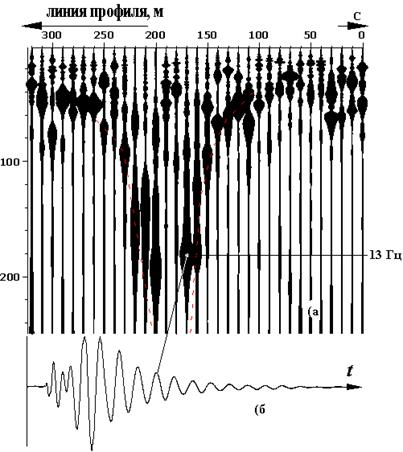 На рис.4а приведен ССП-разрез, полученный при профилировании вблизи объекта, находящегося под воздействием горных ударов. Этот объект - насосная станция очистных сооружений в пос. Ольгино, СПб. Как видно, насосная станция находится в зоне тектонического нарушения. Здесь следует обратить внимание на то, что вблизи 170-го метра профиля сейсмосигнал содержит очень высокодобротную спектральную составляющую, что показано на рис. 4б. Частота этой составляющей - 13 Гц. Вблизи этой же частоты оказалась и частота вибрации механизмов насосной станции. В результате, периодически возникают резонансные явления, амплитуда колебаний возрастает настолько, что грунт разрушается, и насосная станция толчком проваливается в него.