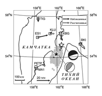В течение периода наблюдений произошло крупное субдукционное межплитовое Кроноцкое землетрясение в районе Камчатки (Mw =7,8; 5 декабря 1997 года). Его зона афтершоков расположена в верхней части континентального склона Камчатки вблизи полуострова Кроноцкий и охватывает зону приблизительно 220x110 км вдоль направления островной дуги (ССВ, ЮЮЗ). Гипоцентр афтершоков, определенный местной сейсмической сетью, определяет в качестве действующей плоскость разрыва, наклоненную под 23o ЗСЗ под Камчатку. Землетрясение предварялось плотным форшоковым роем, который начался за двое суток до землетрясения вблизи ССВ оконечности афтершоковой зоны. Очаговый разрыв возник около этой точки и распространился приблизительно на 180 км к ЮЮЗ со скоростью 4 км/с 2 . Наблюдения GPS обнаружили хорошо выраженные пресейсмические, косейсмические и постсейсмические деформации, связанные с этим событием. Они и обсуждаются в данной статье. Высокие скорости деформации наблюдались также в течение последующих двух лет. Анализ деформаций дает предварительные оценки относительных скоростей движения плит в упомянутой зоне стыка четырех плит. Данные показывают наличие упругой реакции Охотской и Берингийской плит. Это означает достаточно высокий уровень их сцепления (каплинга) с субдуцирующей Тихоокеанской плитой. Впервые обнаружена большая величина медленной деформации перед крупным субдукционным землетрясением.