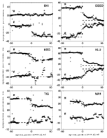 Рис.6 показывает интервалы времени +/-55 дней от сильного землетрясения 05.12.1997 г. для двух горизонтальных компонент (N, E) каждой из шести станций BKI, KBG, KLU, ESSO, TIG и MA1. Для TIL и KMS данные за период, близкий к сильным землетрясениям, отсутствуют. Исходные 24-х-часовые средние показаны крестиками. Для подавления единичных и двойных выбросов применялось сглаживание скользящей медианой по пяти точкам. Следует отметить, что большое количество фиктивных аномалий с длительностью от 3 до 10 дней или более, подобная процедура подавить не в состоянии, и они могут быть идентифицированы только субъективно. Медианная фильтрация останавливалась за три точки до и продолжалась через три точки после интервала, содержащего сильное землетрясение. Для этого конкретного интервала данные опущены. Последняя точка исходных данных перед и первая точка после этого интервала дополнительно помечена (квадрат).