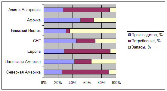 | Регион | Производство, % | Потребление, % | Запасы, % |