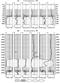 1180 м) также наблюдается последовательная смена преимущественно оливиновых, двупироксеновых и двупироксен-плагиоклазовых пород, но в отличии от разреза верхнего ритма он характеризуется совершенно другим мотивом геохимической структуры. Для этой толщи характеры повышенные содержания когерентных элементов (Ni, Cr, V) и "относительно некогерентного" титана при пониженных концентрациях Sc. Это находит отражение в увеличении показателей Ni/(V+Ni) и V/(Ga+V) на фоне снижения Sc/(Ga+Sc). Указанные геохимические различия верхнего и нижнего ритмов позволяют высказать сомнения в реалистичности предположений о механическом сдвоении одного и того же разреза в керне этой скважины, которое могло произойти за счет тектонических сдвигов.