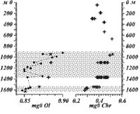 Представление о вариациях состава Ol в серпентинизированной части разреза дают также результаты изучения составов акцессорного хромита. Этот минерал обладает высокой устойчивостью в процессах серпентинизации силикатов. В частности, хромиты Бураковско-Аганозёрского плутона не имеют магнетитовых "рубашек", что характерно для более высокотемпературных вторичных изменений [19]. Известно, что для шпинелидов характерен быстрый диффузионный обмен ионами Fe2+ и Mg2+ с сосуществующими фемическими минералами. Это обусловлено тем, что коэффициенты диффузии двухвалентных катионов в шпинелиде примерно в 1.5 раза выше, чем в оливине [20]. Таким образом, можно предположить, что магнезиальность реально наблюдаемого хромита должна коррелировать с изменением состава Ol, который на 95-98% слагает исследуемые адкумулаты. Эти вариации приведены на Рис 3. Как и следовало ожидать, в неметаморфизованной части разреза состав хромита изменяется параллельно составу Ol. Далее вверх по разрезу магнезиальность минералов понижается до значений, характерных для приконтактовых пород. Таким образом, зона оливиновых кумулатов Аганозёрского блока до серпентинизации характеризовалась максимумом показателя валовой магнезиальности, расположенного вблизи середины её разреза.