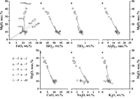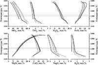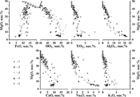 Сравнительный анализ составов модельных расплавов при одних и тех же значениях температур позволяет найти области сгущения и пересечения эволюционных линий. Было показано, что наиболее компактные кластеры составов по петрогенным компонентам формируются в ограниченном диапазоне температур (в пределах 10-15о С), которые отражают начальные условия формирования генетически родственных пород [2]. При этом среднее значение для температурного интервала пересечений линий эволюции состава жидкости рассматривается как наиболее вероятная температура исходной расплавно-кристаллической смеси, а "равновесный" состав минералов принимается в качестве первичного (исходного). Состав жидкости, находящейся в равновесии с первичными кристаллами, определяет исходный расплав - в том смысле, что он соответствует состоянию смеси до того, как в ней пройдут процессы докристаллизации и (возможно) перекристаллизации.