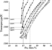 0.6 (погрешности указаны в равномерной метрике). Обе эти оценки близки исходному составу Fo87, который принят на основании микрозондовых данных (см. выше). В дальнейшем, интервал содержаний 87-88 мол.% Fo будет использован в качестве главного критерия поиска температуры и состава исходного магматического расплава по результатам моделирования первичных расплавно-кристаллических равновесий.
