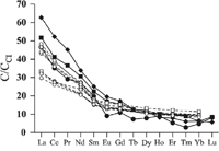Основываясь на структурно-геологическом анализе региона, сходных петрохимических характеристиках пород и близости абсолютных датировок В.С. Куликов [34] выдвинул гипотезу о том, что Бураковско-Аганозёрский плутон вместе с эффузивами свиты Ветреного пояса принадлежит к единой магматической формации, являясь их глубинным аналогом. Полученные характеристики родоначального расплава Бураковско-Аганозёрского плутона позволяют провести более детальное сопоставление химизма этих образований. Для сравнительного анализа были привлечены наименее магнезиальные (MgO<11%) составы лавовых потоков [33, 35], как содержащие минимальное количество интрателлурических вкрапленников оливина. Близость петрохимических составов вулканитов и модельных составов AGL и SHL демонстрирует Рис. 10. Сравнение хондрит-нормализованных [36] спектров пород краевой группы Аганозёрского блока с составами вулканитов Ветреного пояса также приводит к выводу об их близости (Рис. 11). Наблюдаются только незначительные отклонения: по лёгким лантаноидам спектры краевой группы соответствуют верхней огибающей поля составов базальтов, а по тяжелым - нижней. По-видимому, это связано с наличием в расплаве базальтов свиты кристаллов оливина, интрателлурические вкрапленники которого наблюдаются даже в шлаковой корке потока [34]. Занижение концентраций лёгких лантаноидов и некоторое завышение содержаний тяжелых происходит из-за различий их коэффициентов распределения оливин-расплав.
