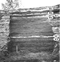 Эпизодические исторические свидетельства об извержениях камчатских вулканов ограничиваются всего последними тремя столетиями, более или менее систематизированные XX веком. Узнать о более ранних извержениях возможно только в процессе геологических исследований, среди которых первостепенную роль играет тефрохронологический метод . Суть метода заключается в выявлении, прослеживании и датировании прослоев тефры (вулканических пеплов), фиксирующих, как правило, наиболее сильные вулканические извержения. Они залегают в так называемом почвенно-пирокластическом чехле, представляющем собой "слоеный пирог" из чередующихся горизонтов пеплов и погребенных почв (рис.1).