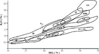 отсутствие таких минералов позволяло отличать тефру отдельных извержений. Различное содержание К2 О дало возможность отнести пирокластику к тому или иному геохимическому типу пород, выделенных О.Н. Волынцом [39]. Это также явилось хорошим критерием идентификации продуктов разных вулканических центров (рис.4, табл.1). Более детально тефрохронологические работы велись вблизи действующих вулканов: здесь проводилось дешифрирование аэрофотоснимков и полевые исследования с картированием центров извержений (кратеров и кальдер), пирокластических потоков и покровов; в разрезах изучались как тефра, так и отложения пирокластических волн и пирокластических потоков.