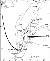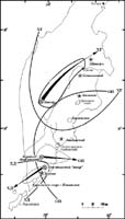 Карымская кальдера сформировалась почти одновременно (~7900 14 С л.н., ~6600 лет до н.э.) с вышеописанной [7,11]. В ней сейчас располагается Карымский вулкан. По характеру и параметрам это извержение очень сходно с извержением вулкана Кракатау 1883 г. Общий объем пирокластики кальдерообразующего извержения - 13-16 км3 , размер кальдеры 5х6,5 км, объем полости кальдеры 7-8 км3 . Извержение началось с выбросов ювенильной пемзовой тефры ("нижние лапилли"); основная ось пеплопада была ориентирована в ВЮВ направлении. Затем последовало образование серии пирокластических потоков, главные ветви которых прошли по рекам Крестьянская и Карымская (рис.6). Пирокластические потоки покрыли общую площадь 150 км2 и имели длину 10-15 км. Сопутствующие пирокластическим потокам "палящие тучи" отрывались от них, распространялись на расстояние более 30 км и достигали берега Тихого океана, покрывая обширные территории тонким пеплом, содержащим мелкие рассеянные угли. Вслед за извержением пирокластических потоков произошла новая серия эксплозивных выбросов, самый мощный из которых дал горизонт "верхние лапилли"; ось пеплопада прошла в ВСВ направлении. Объем отложений пирокластических потоков составил 4,5-6 км3 , суммарный объем тефры - 8-10 км3 . Главный сектор рассеяния пепла располагался к востоку от кальдеры и значительная его часть выпала над акваторией океана (рис.5). В разрезах на Командорских островах в 450 км от источника пепел этого извержения имеет мощность 3 см [19]. Отсутстиве в пепле КРМ роговой обманки и биотита позволяет отличать его от стратиграфически близких пеплов кальдеры Курильское озеро-Ильинская (КО), вулкана Кизимен (КЗ) и вулкана Хангар (ХГ) [33].
