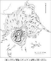 Самая ранняя голоценовая кальдера Ксудач - кальдера III - сформировалась в ходе извержения КС4 ~ 8800 14 С л.н. (~ 7900 лет до н.э.). Ювенильный материал извержения представлен тефрой и отложениями пирокластических потоков. Ось пеплопада была направлена на юго-запад. Тефра этого извержения четко прослеживается до широты вулкана Ильинский, где она перекрывается мощными пирокластическими отложениями, связанными с формированием кальдеры Курильское озеро-Ильинская. Крупные бомбы в местах их максимального скопления вблизи центра извержения спекаются и образуют игнимбриты-агглютинаты, аналогичные таковым для извержения КС2 . Пирокластические потоки отмечены в долине р.Теплая и на северо-восточном склоне вулкана. Общий объем ювенильного материала извержения составляет 1,5-2 км3 . В ходе извержения происходили также мощные взрывы с разрушением субстрата и формированием грубообломочных брекчий [23]. В результате извержения КС4 сформировалась кальдера III. Ее точные границы и конфигурация не могут быть установлены из-за того, что этот участок был кардинально преобразован при формировании более молодых кальдер. Предполагаемый поперечник кальдеры 2-3 км.