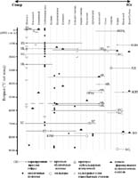 Интересно отметить, что в сравнительно коротком интервале 7500-7900 14 С л.н. в Курило-Камчатской области отмечается мощная вспышка вулканической активности [11,22]. В это время почти субодновременно произошло несколько крупнейших эксплозивных извержений, связанных с формированием кальдер Курильское озеро-Ильинская, Карымская и Тао-Русыр (последняя на Курильских островах) [10,32], имели место мощные извержения вулканов Кизимен (КЗ) и Авачинский (IАв2). В это же время произошла сближенная во времени серия извержений на вулкане Шивелуч с общим объемом продуктов 2-3 км3 [22]. Несколько позднее (6900 14 С) имело место мощное извержение вулкана Хангар. В работе [40] обращается внимание на вклад крупнейших извержений начала голоцена в похолодание климата этого времени. Можно полагать, что указанные камчатские извержения составили существенную часть этого вклада.
