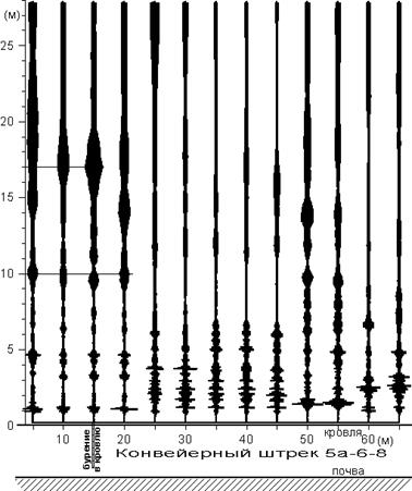 Естественно, не может не возникнуть вопрос, почему эти границы на малых, самых существенных для оценки устойчивости высотах, не были выявлены бурением. Как оказалось в дальнейшем, в результате анализа обрушившихся пород кровли, границы на малых высотах были обусловлены наличием углистых сверхтонких прослоев. С помощью бурения такие границы определить нельзя, так как керн при их пересечении ломается, а поскольку бурение идет с промывкой, то следы угля на изломах керна вымываются промывочной жидкостью.