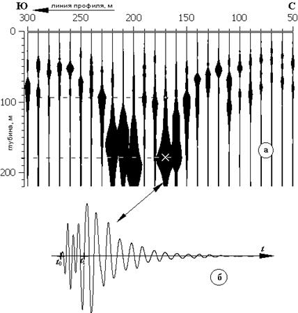 Разрез довольно сложный, характерный для ранее заболоченной, но осушенной местности. Заболоченная местность формируется, как известно, в зонах множественных пересекающихся мелких тектонических нарушений. На 80-м метре профиля видна граница на глубине около 250 м, сигнал по которой имеет добротность, равную 100, что многократно превышает добротности сигналов по всем остальным границам. На рис. 3б показан сейсмосигнал в этой точке измерений подобно тому, как это сделано на рис. 2.