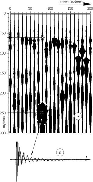 На рис. 3а приведен 200-метровый отрезок ССП-разреза, полученного при профилировании в мае 1999 года вдоль железнодорожного полотна вблизи 1545 км участка Москва - Красное, вблизи г. Гагарина.