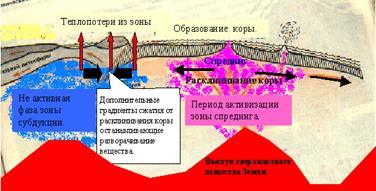 С точки зрения современных взглядов, во время сейсмической активизации рифтовой зоны \место образования новой коры, совпадающей с океаническими хребтами \, происходит нарастание коры, возрастают горизонтальные силы сжатия, которые тут же должны заталкивать ее под материковую. Заталкивание должно сопровождаться повышением сейсмической активности данной зоны, но фактически происходит наоборот. При затухании активности в спрединговых регионах - возобновляется в прибрежных. С позиций предлагаемой гипотезы, процесс противофаз сейсмической активности, является непременным условием. Во время активизации спрединговой зоны, за счет расклинивания, создается дополнительное давление на раздвигаемые участки коры, которое увеличивающимся воздействием на активную зону, затормаживает разворачивание вещества в местах субдукции. Одновременно происходит разогрев, в месте разворачивания, который начинает постепенно его самоограничение, тем временем потеря тепла в неактивной зоне, начинает стимулировать натурализацию. Наступает момент, когда эти взаимодействия переходят пороговые значения, т.е. разогрев остановит разворачивание, а остывание и уменьшающееся латеральное давление на неактивную зону, запустят его в регионе субдукции, таким образом, процесс меняется местами (рис.6).
