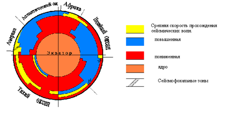 Рис. 7. Схематическое отображение прохождения сейсмических волн при томографии Земли по Хаину, Звереву.