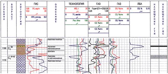 Рис. 3. Пример выделения маломощных нефтенасыщенных пластов по данным ГТИ
