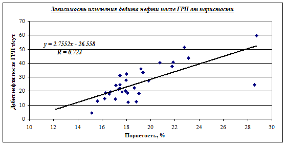 Рис.2. Зависимость изменения дебита нефти после ГРП от пористости.
