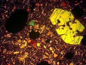 ПК 02/27 Оливиновый базальт. Структура порфировая, пористая, поры расположена хаотически, размеры 0,2 до1,5 мм Вкрапленники представлены кристаллами оливина и плагиоклаза, также встречаются характерные оливин плагиоклазовые сростки. Текстура основной массы интерсертальная - тонкие лейсты плагиоклаза в стекловатой матрице.