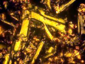 | Фотография 7. На снимке изображена часть поверхности шлифа ПК 02/27. Изображение получено с поляризационного микроскопа Option со включенным анализатором и объективом x10 на левом снимке и x40 на правом. На левом снимке хорошо виден большой фенокристалл оливина (в верхнем правом углу) с областями резорбции, так же видно, что порода пористая, размеры пор варьируют в широком диапазоне. На правом снимке представлен участок основной массы, сложенной вытянутыми кристаллами плагиоклаза и стекловатым агрегатом между кристаллами. |