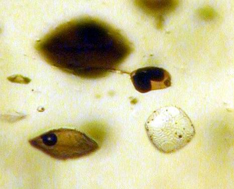 | Фотография 10. Фотография под оптическим увеличением x25 зерна 01 из образца ПК 02/20, где представлен участок поверхности кристалла оливина с захваченными расплавными включениями. На изображении четко видно три включения. В правом нижнем углу светлая почти прозрачная округлая область занята включением одного типа, а два других включения принадлежат к другому типу, они отличаются как цветом, так и формой. В верхнем присутствуют кристаллические фазы. |