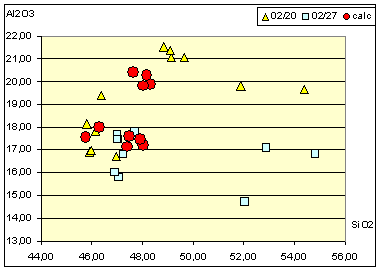 Рисунок 14. На диаграмме представлено распределение составов в координатах Al2 O3 -SiO2 . Треугольниками и квадратами обозначены исходные измеренные составы для образцов ПК-02/20 и ПК-02/27, кружки обозначают откорректированные составы расплавов. На диаграмме видно, что составы можно разделить на две группы по содержанию Al2 O3 |