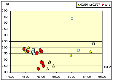 Рисунок 15. На диаграмме представлено распределение составов в координатах TiO-SiO2 . Треугольниками и квадратами обозначены исходные измеренные составы для образцов ПК-02/20 и ПК-02/27, кружки обозначают откорректированные составы расплавов. На диаграмме видно, что составы можно разделить на две группы по содержанию TiO2 |