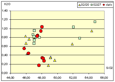 Рисунок 16. На диаграмме представлено распределение составов в координатах K2 O-SiO2 . Треугольниками и квадратами обозначены исходные измеренные составы для образцов ПК-02/20 и ПК-02/27, кружки обозначают откорректированные составы расплавов. На диаграмме видно, что составы можно разделить на две группы по содержанию K2 O |