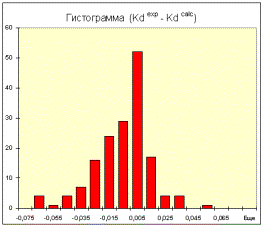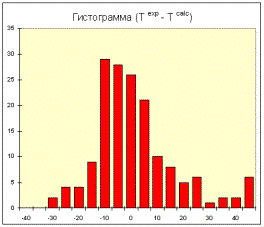 В качестве другого критерия равновесия был рассмотрен коэффициент распределения Fe/Mg между оливином и расплавом. KdFe-Mg (Ol-L) = (xFeO /xMgO )Ol / (xFeO /xMgO )L . Для выяснения диапазона значений Kd в равновесных системах была использована база данных петрографических экспериментов Inforex [Ariskin]. Была получена выборка (более 150 экспериментальных составов расплав-оливин) для оценки значений Kd. Выборка составов удовлетворяла следующим условия: земные составы, с содержанием воды 0%, при атмосферном давлений (p < 0,1 kbar), с длительностью эксперимента более 48 часов, содержания щелочей менее 5%, содержания магния от 5% до 15%. Все составы из данной выборки были использованы в программе КОМАГМАТ 3.52 для расчет равновесных пар оливин-расплав. Полученные данные сравнивались с исходными экспериментальными данными. Как видно из графиков (рис. 17) распределение отклонений расчетных и экспериментальных параметров (температура, номер оливина, Kd) отвечает нормальному закону распределения, за исключением небольшого числа отскоков. Для дальнейшей работы все отклонения, превышающие 3 стандартных, были отбракованы. Результаты отбраковки представлены на гистограммах распределения (см. рисунок 17)