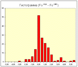 | Рисунок 17. На левом рисунке представлена гистограмма отклонений расчетных температур равновесия (по программе КОМАГМАТ 3.52) от экспериментальных (взятых из базы Inforex). Данное распределения отвечает нормальному (Гауссовскому) распределению. На правом рисунке гистограмма отклонений расчетного номера оливина Fo (по программе КОМАГМАТ 3.52) от экспериментального (взятых из базы Inforex). Данное распределение также описывается нормальным законом. |
