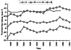 При обосновании сценариев умеренного потепления климата, помимо данных метеостанций, используются также результаты наблюдений на геокриологических (мерзлотных) стационарах, где одновременно с метеорологическими измерениями исследуются тепловой режим грунтов, сезонное промерзание - протаивание и мерзлотные процессы (А.В.Павлов). Такое сочетание повышает достоверность мерзлотно-климатических прогнозов. Остановимся на этой проблеме подробнее.