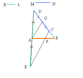 Построение точки F, делящей отрезок АВ в отношении AF:BF =KL: MN, произведём аналогично построению середины отрезка АВ, описанному в решении задачи 5. Отличие будет состоять в том, что точку С выберем на расстоянии KL от точки В, а точку D - на расстоянии 2MN от точки С. В этом случае прямая EC по-прежнему будет параллельна отрезку AG, а значит, разделит отрезок АВ в том же отношении, в котором она делит отрезок BG.