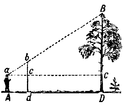 Запасшись шестом выше своего роста, воткните его в землю отвесно на некотором расстоянии от измеряемого дерева. Отойдите от шеста назад, по продолжению Dd до того места А, с которого, глядя на вершину дерева, вы увидите на одной линии с ней верхнюю точку b шеста. Затем, не меняя положения головы, смотрите по направлению горизонтальной прямой aC, замечая точки с и С, в которых луч зрения встречает шест и ствол. Попросите помощника сделать в этих местах пометки, и наблюдение окончено. Остаётся только на основании подобия треугольников adc и aBC вычислить ВС из пропорции