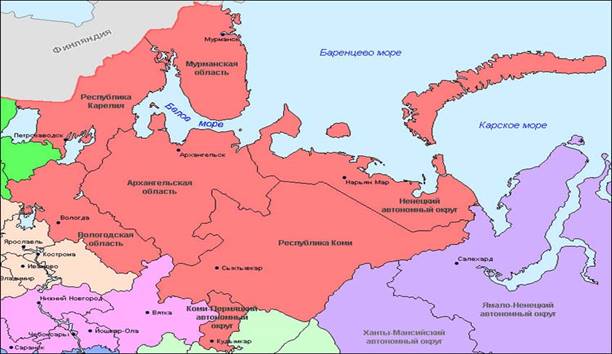 Северный экономический район охватывает обширное пространство европейской части страны площадью 1500 тыс. км2, выходящее к Баренцеву и Белому морям Северного Ледовитого океана. В его состав входят Архангельская, Мурманская, Вологодская области, Ненецкий автономный округ, Карельская республика и республика Коми. В нем проживает около 6 млн. чел.