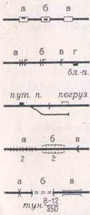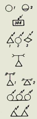 4. Расположение главного здания станции: а) сбоку путей; б) между путями; в) расположение неизвестно 5. Электрифицированные железные дороги: а) трёхпутные; б) двухпутные; в) однопутные; г) блок посты 6. Путевые посты, погрузочно-разгрузочные площадки, тупики и подъездные пути 7. а) Насыпи; б) выемки (2-высота или глубина в метрах); в) участки с большими уклонами – более 0,020 (только в горных районах) 8. а) Трубы; б) туннели (в числителе – высота и ширина, в знаменателе – длина в метрах) в) эстакады 9. Автострады (8 – ширина одной полосы в метрах, 2 – количество полос, Ц – материал покрытия); насыпи (4 – высота насыпи в метрах) 10. Шоссе (6 – ширина покрытой части; 10 – ширина всей дороги от канавы до канавы в метрах; Б – материал покрытия) 11. Улучшенные грунтовые дороги (8 – ширина проезжей части дороги в метрах) и труднопроезжие участки дорог 12. Грунтовые (просёлочные) дороги и труднопроезжие участки дорог 13. Полевые и лесные дороги 14. Зимние дороги (через замёрзшие болота, озёра, реки) 15. Дороги с деревянным покрытием 16. Фашинные участки дорог, гати и гребли |