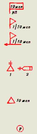 1. Пункт управления полка на месте. Надпись КП обозначает - командный пункт, ТПУ - тыловой пункт управления. Надпись внутри флажка -номер полка. 2. Пункт управления батальона. Надпись 1/10 мсп означает 1 батальон 10 мотострелкового полка. 3. То же в движении. 4. 1- Командно-наблюдательный пункт командира роты на месте. 2- БМП командира роты (соответственно обозначается БТР, танк командира роты. Ставится такт. знак данного типа техники и две черточки. У командира взвода одна черточка. 5. Наблюдательный пункт 10 мотострелкового полка. Если внутри знака буква, то это означатет что НП специализированный (А-артилерийский, И-инженерный, Х-химический, В-воздушного наблюдения, Т- технический). В артиллерии, спец.войсках знак черный. 6. Пост регулирования движения (Р-регулировщик, КПП-контрольно-пропускной пункт, КТП-контрольно-технический пункт. 7. Узел связи. 1- полевой подвижный. 2- стационарный. 8. Радиоприемник. 305- марка приемника. 9. Радиостанция. 1-подвижная, 2- носимая. 3- танковая. 10. Подвижная радиорелейная станция. 11. Радиолокационная станция разведки. 1- воздушных целей. 2-наземных целей. 12. Радиосеть носимых станций. 13. Радионаправление подвижных станций. |