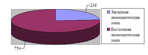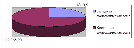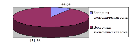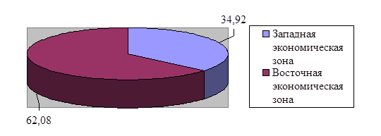 Таким образом, как говорилось выше, Восточная экономическая зона по площади превосходит Западную. Восточная экономическая зона составляет 75 % всей площади РФ.